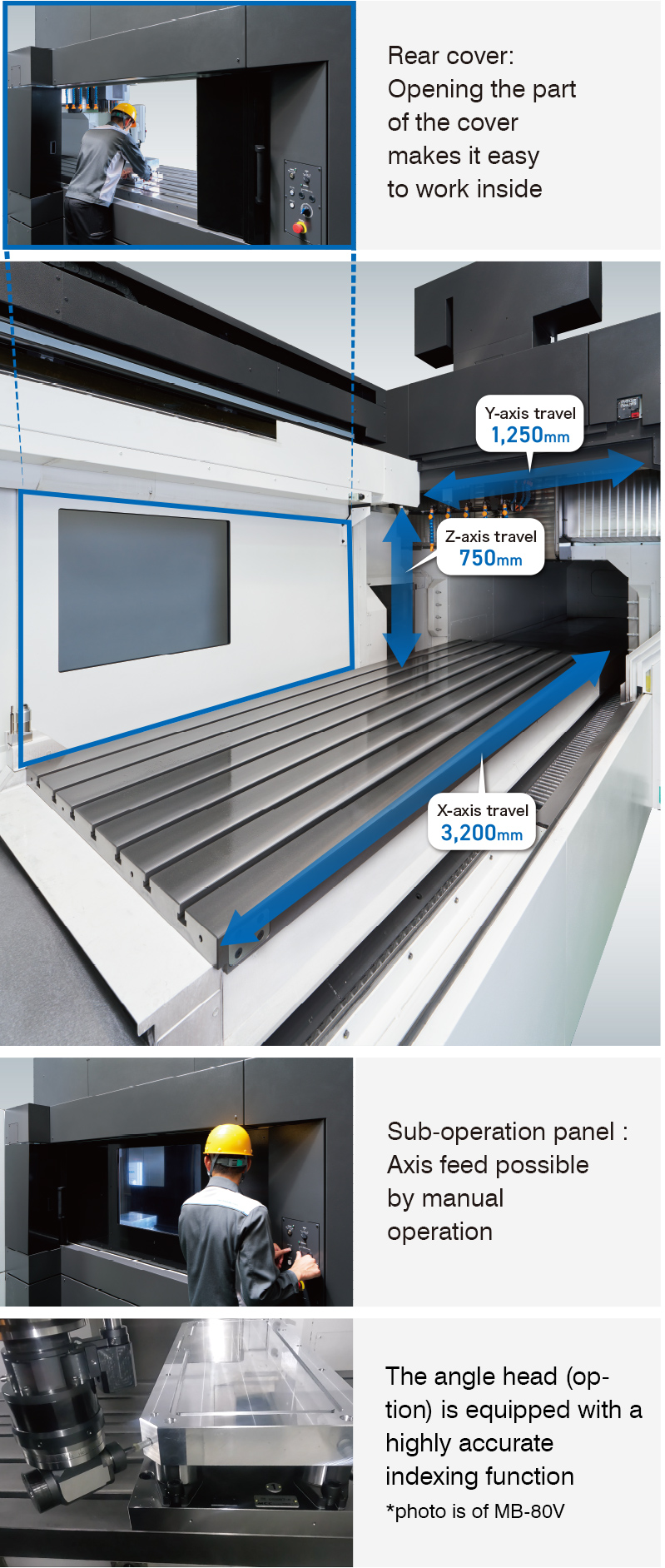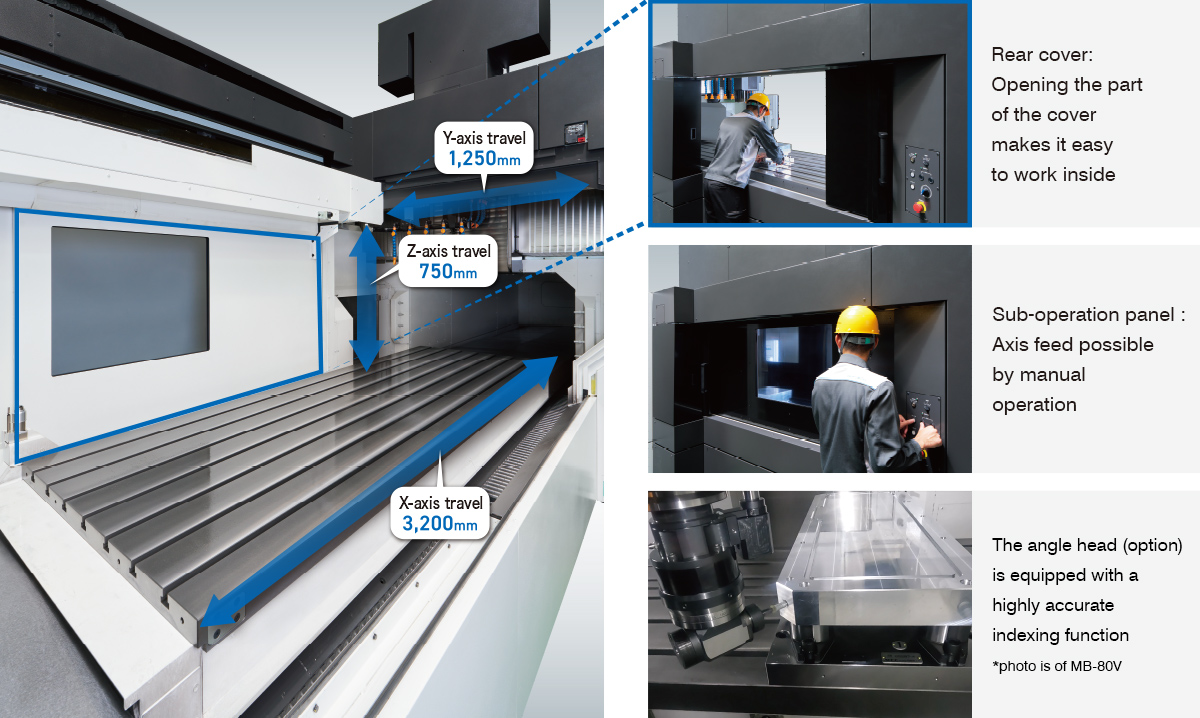 The MB-100V is a powerful, high-precision vertical machining center built with a double-column structure and is able to machine large workpieces with ease. Also, its space-saving design contributes to saving floor space in the factory. The machine construction takes into consideration setup work for large parts, and it is equipped with a large stroke and solutions for multi-sided machining, minimizing the operator’s workload.