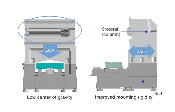 - Restraining vibration by improving construction of the low center of gravity and the rigidity of the attaching portions of the crossrail (column) and bed Preventing defects of the tool and workpieces when difficult-to-cut materials are machined