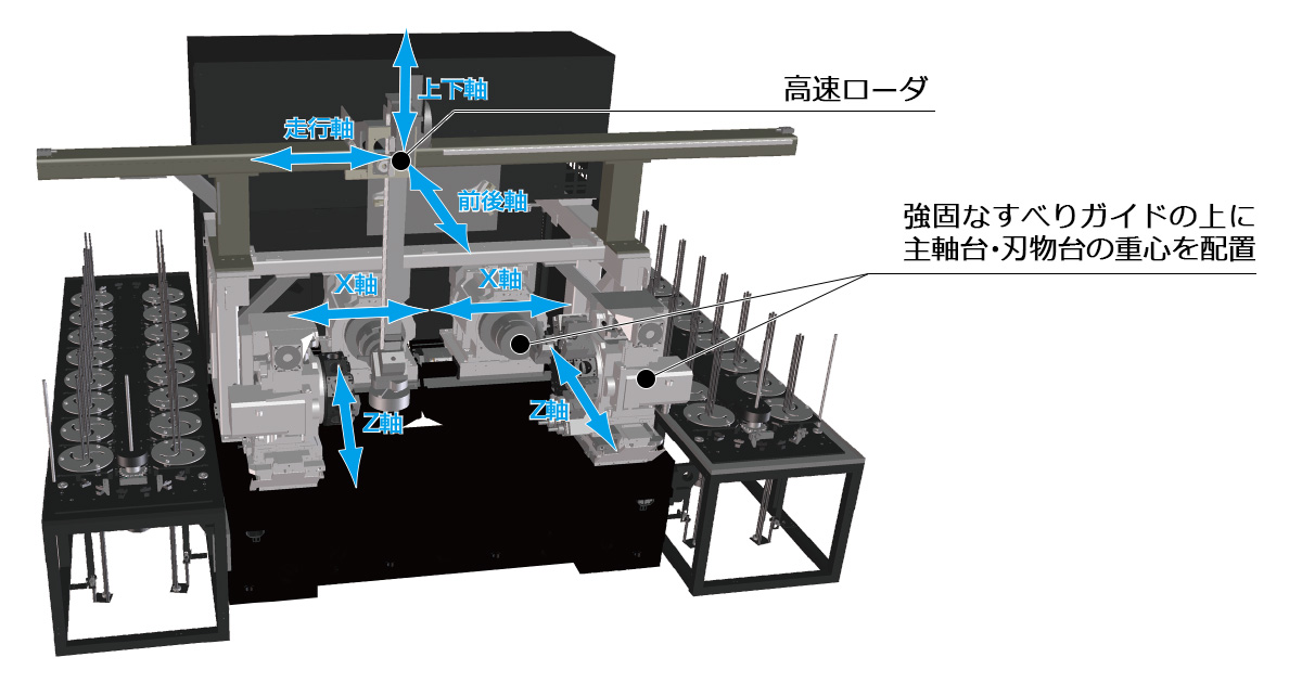 また、強固なすべりガイドの上に移動体(主軸台・刃物台)の重心を配置。