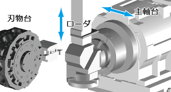 ワーク着脱時は主軸台が着脱位置に移動。刃物台の位置にかかわらずローダが機械へ進入可能です。