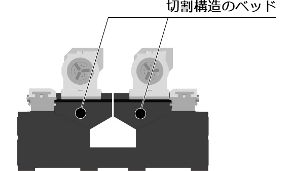 ベッド形状は切割構造を採用。左右分離することで切削時の振動伝達を抑制します。高い面粗度要求にも効果を発揮します。