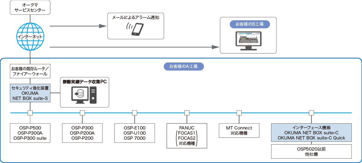 OKUMA NET BOX suite-S(特別仕様)を使用することで、Connect Planはインターネットにつながり、離れた場所にある工場の稼働状況が見えるようになるほか、工場外から工場の稼働状態を確認したり、機械でアラームが発生したことを伝えるメールを確認したり、オークマのサービスセンターとつながり、オンラインでサポートを受けることができます。