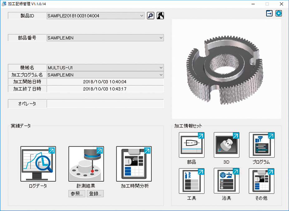 加工記録管理は、加工したワークの固有のIDと、機械ごとの加工実績や工程表、計測結果を紐付けて、加工のトレーサビリティを実現する機能です。