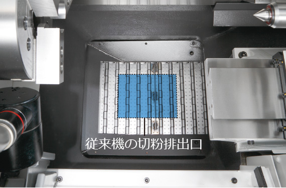 切粉排出口を従来機比較で1.8倍に拡大。切粉の堆積を最小限に抑えます。清掃の頻度を少なくして、稼働時間を最大化します。