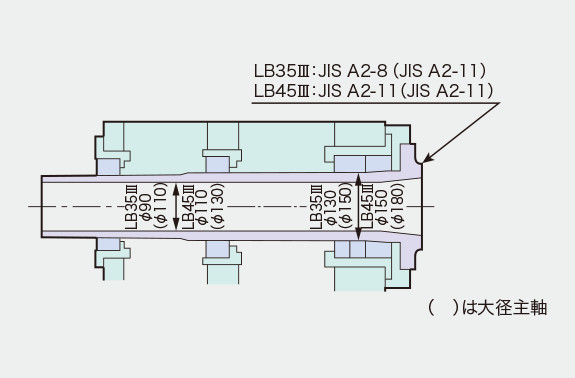● | 高剛性のビルトイン方式を標準採用。 クイル径 LB35Ⅲ:ø120mm、LB45Ⅲ:ø130mm 心押台ビルトイン MT.No5 |