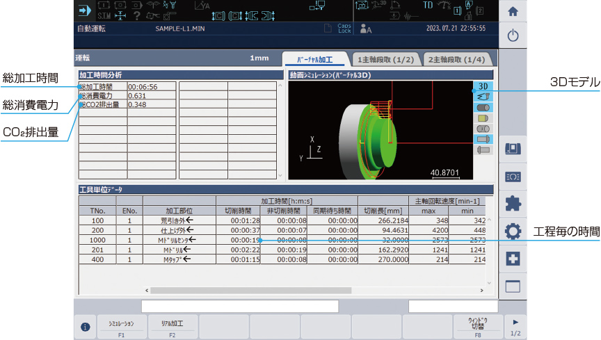 軸動作だけでなく、自動工具交換装置などの周辺ユニットにも着目し、機械で動作したリアルな駆動データを収集、仮想機械にフィードバックすることで、正確な時間見積を実現します。さらに、消費電力、CO2排出量も表示します。