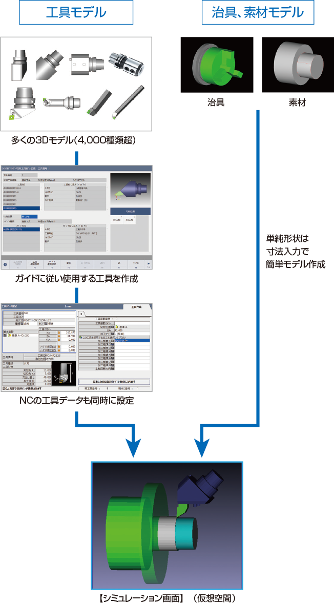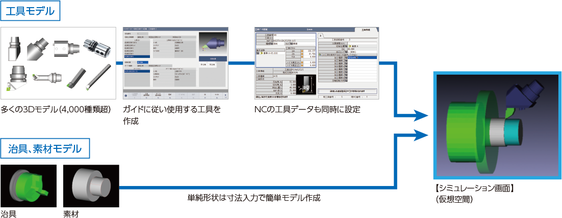 シミュレーション用の工具のモデリングが簡単に作成可能です。4,000種類以上の3Dモデルを準備していますので、これまで簡単モデリングで作成していた工具の3Dモデルが簡単に準備できます。
