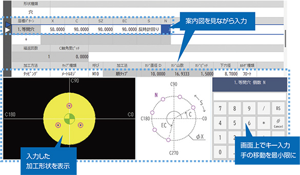 - 従来は図面を元に、加工の設定や工程をGMコードで記述して加工の準備をしていましたが、ガイドに従い図面情報を入力するだけで、加工工程は自動で決定します(一部特別仕様)。GMコードのプログラムを途中挿入する機能も備え、お客様のノウハウを活用する事が可能です。