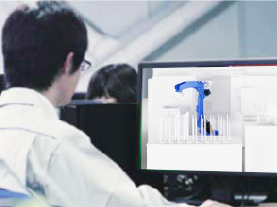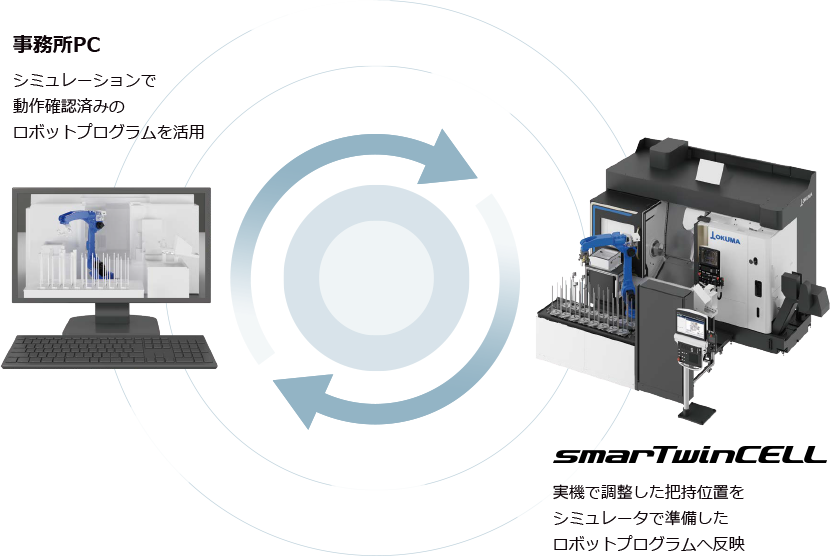 smarTwinCELLではシミュレータにより、生産中に事務所のPCでロボットプログラム作成、干渉を含めた動作確認、サイクルタイム見積が可能です。