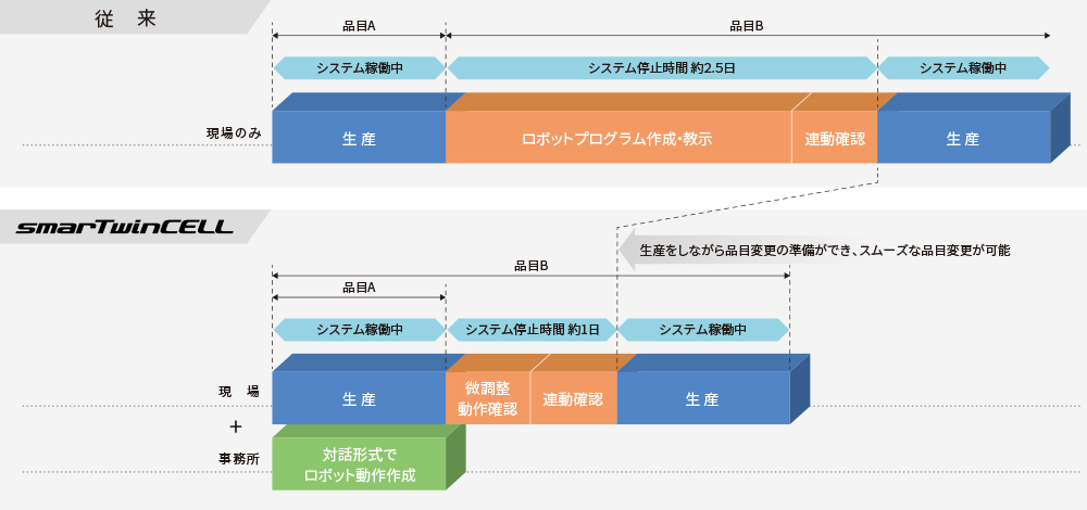 従来のロボット動作作成には、ロボットプログラム作成・教示、連動確認のためにシステムを停止させる必要がありました。