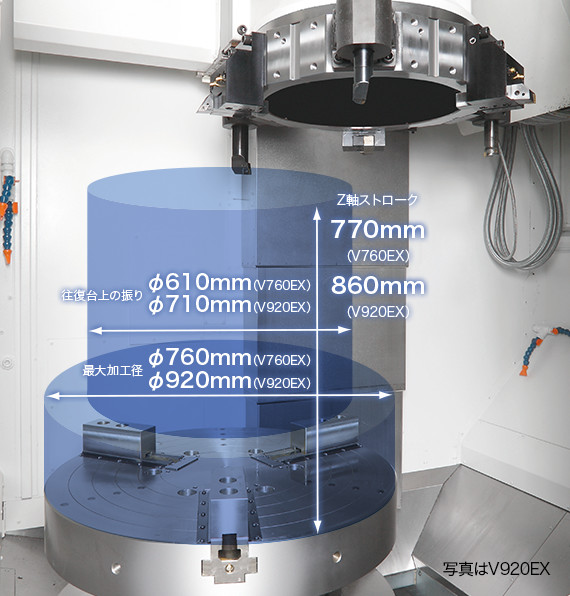 省スペース化を図りながら、ワイドな加工領域を実現。異形ワークのチャッキングにも十分なスペース(最大振り:ø800mm/V760EX、ø1,000mm/V920EX)を確保し、お客様の幅広い加工ニーズに対応します。