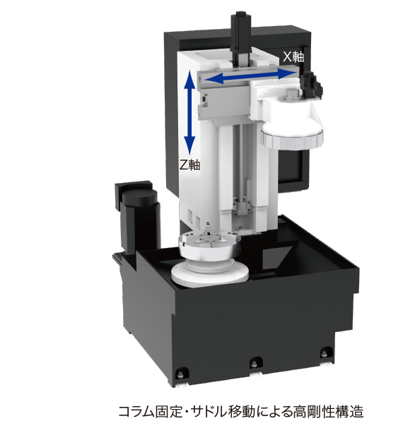 剛性、減衰性の高い大形ベースに強固な箱形コラムを固定。刃先とガイドの距離が近く、重切削による負荷にも十分に耐えられる剛性を確保しました。X、Z軸の案内面には、角形すべりガイドを採用することで、大物ワークの強力・高精度加工を実現します。